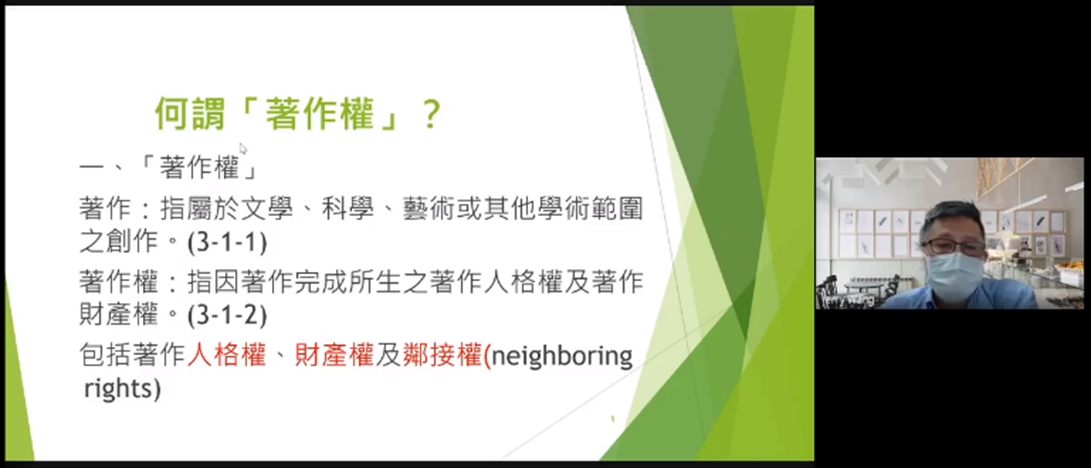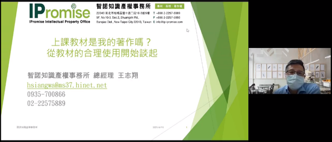 隨著科技不斷進步,保護智慧財產權之觀念漸漸提升。今日資訊的突飛猛進,侵犯智慧財產權的案例也越來越多,因此如何保護智慧財產權議題變得相當重要,為了加強全校教職員智慧財產權之概念,特邀智諾知識產權事務所王志翔總經理線上演講。講座內容主要說明了校園著作權合理使用、著作權相關權責與限制等,活動內容中分享了許多日常中的實際案例,讓參與者可以清楚了解校園智慧財產權基本概念及合理使用,以期防患於未然。