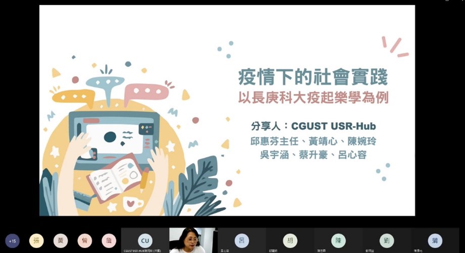 長庚科技大學USR Hub團隊提出「疫起樂學」計畫,會議中分享在COVID-19疫情影響下,大多數人日常生活帶來很大的變化,上班族、學生、老年人重新學習適應因疫情帶來的各種不便,長庚科技大學USR Hub團隊提出嚐試整合生活資訊、防疫須知、線上學習、防疫健康食譜等資源,提供在地居民在家自學平台,期許能共同為地方共生共榮、永續發展而努力,共創社會參與及公民培力之典範。