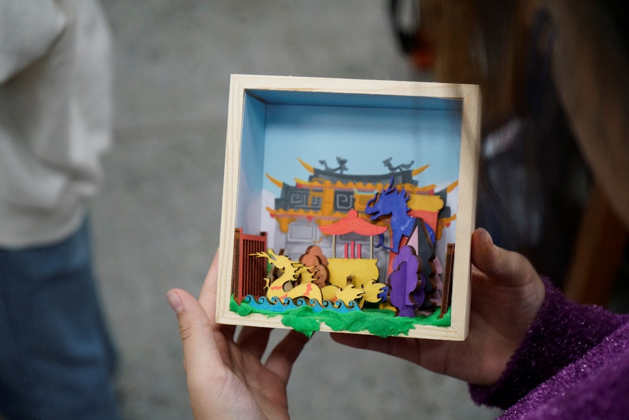 在陪伴創作與分享的過程中,也發現孩子並不缺乏想像力,而是需要被鼓勵表達的機會。當孩子願意站起來介紹自己的作品、說明顏色與元素的選擇時,語氣中多了一份自信與認同感。學生們也表示,很高興能有機會將原本停留在企劃書與設計稿上的專題,真正帶進校園,落實在真實的教學現場。