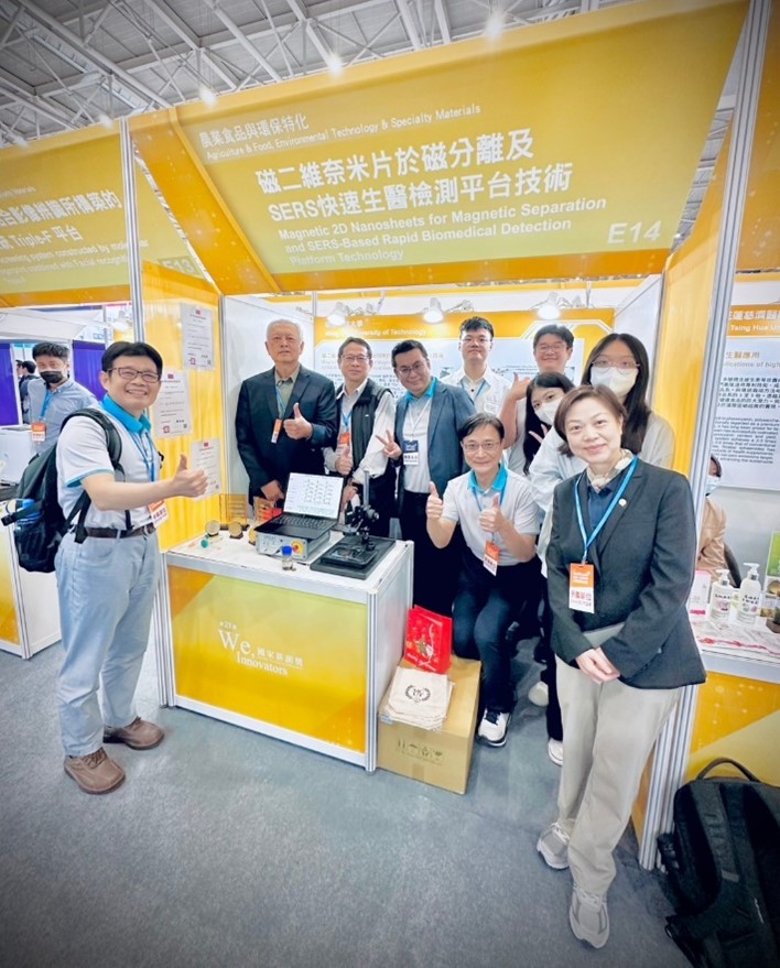 今年該校材料系劉定宇老師研發作品磁性金屬二維奈米片於磁分離及SERS快速生醫檢測平台技術,利用SERS光譜靈敏且專一效果,可輕易抓取並濃縮如細菌、病毒、尿毒素、水中毒物等待測物,完成一個高度層次整合的解決方案,這項榮獲今年國家新創精進獎,將同步於醫療科技展會場中InnoZone 創新技術特展展出。