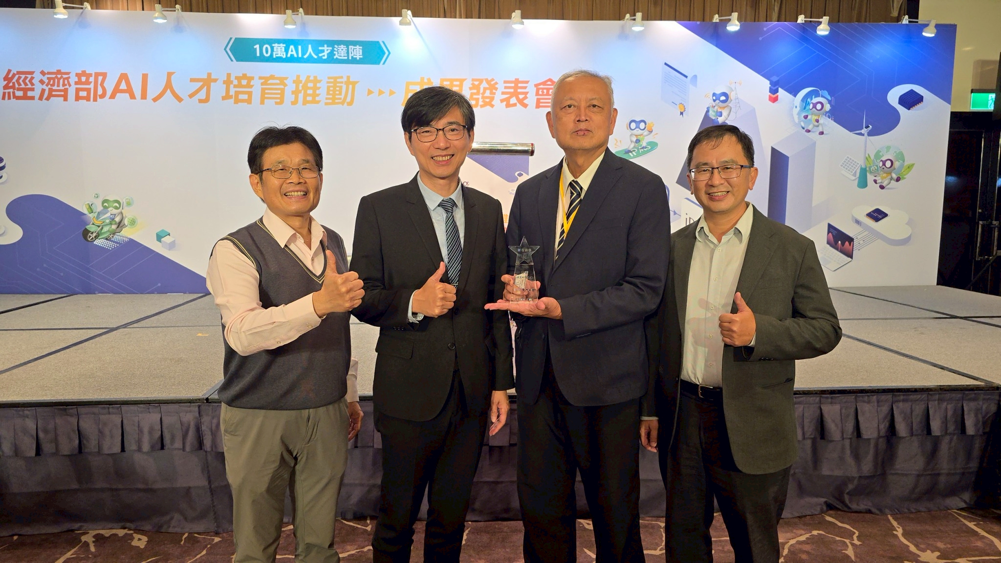 圖三說明:明志科技大學劉祖華校長(右2)、陳勝吉研發長(左1)與經濟部產發署邱求慧署長(左2)及顏鳳旗組長(右1)於「經濟部 AI人才培育推動成果發表會」會場合影。