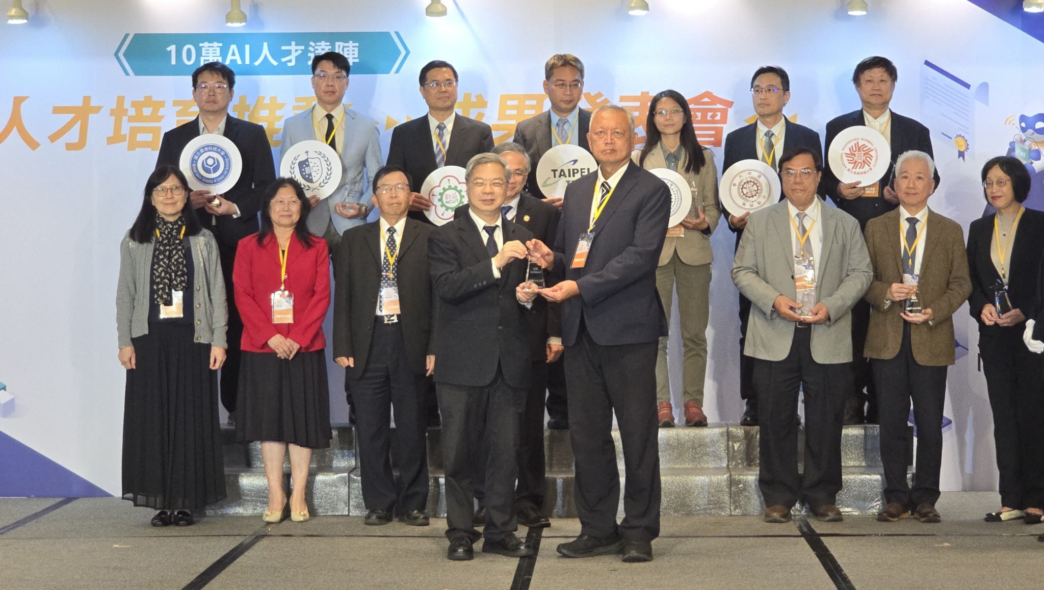 圖一說明:明志科技大學劉祖華校長(前排右)「經濟部 AI人才培育推動成果發表會」接受經濟部龔明鑫部長致頒「iPAS 育才卓越獎」。