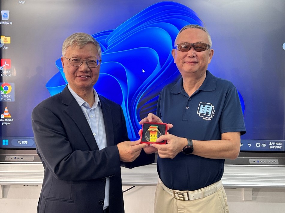 圖二說明:校友會黃力中理事長(右)頒發「系友之光」獎牌予施俊銘學長(左),推崇其不忘初心的回饋精神,並感謝他長期以來對系務發展的支持。