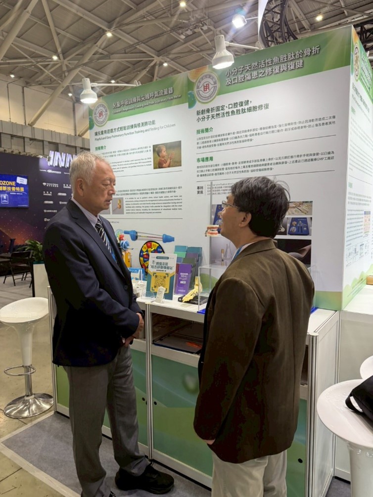Image (No. 2) Description: Assistant Professor Hu Chih-chung briefs the President on his team's development of Bioactive fish peptides for fracture and oral injury repair.