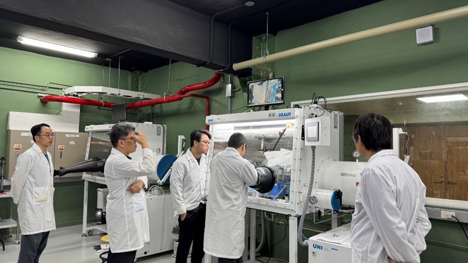 圖四說明:參與教師於手套箱設備前觀摩鋰電池組裝與實驗操作流程,了解電池製作之實務環境與技術應用。