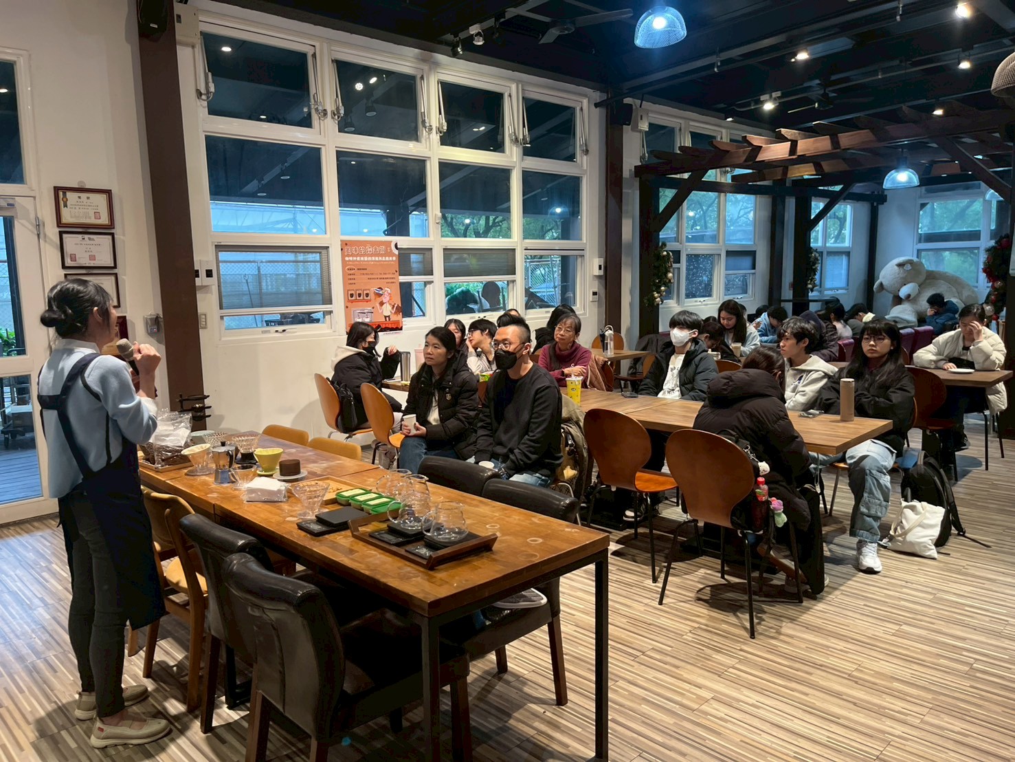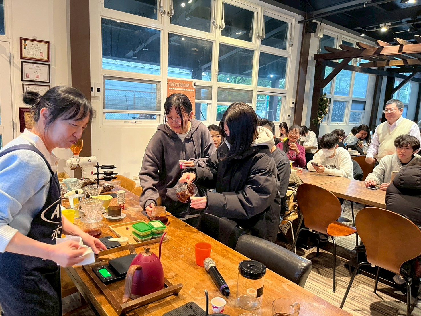 活動過程中,講師與學生之間互動頻繁,講師也針對沖煮技巧與風味判斷進行回應,讓整體學習更加具體。除了技術層面的介紹,講師也分享自身在咖啡領域的學習與競賽經驗,讓學生了解相關專業的發展方向與所需投入。