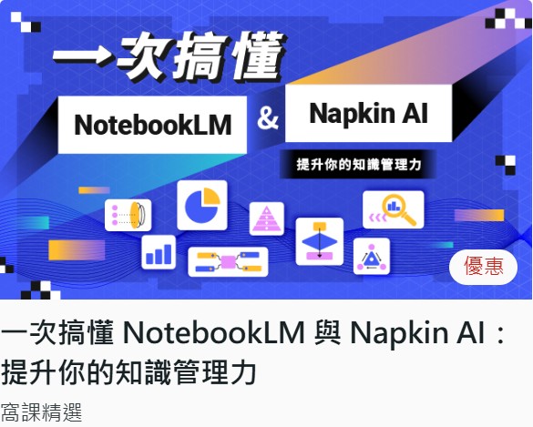 「一次搞懂 NotebookLM 與 Napkin AI」課程聚焦於 AI 在學習、研究與簡報製作上的實務應用。課程從 NotebookLM 的介面操作與建立第一本AI筆記本開始,逐步引導學員將重要回覆整理成記事,並轉換為可分析的資料來源;同時透過心智圖功能,協助學員梳理研究脈絡與思考架構,提升資訊整合與表達能力。學員在實作過程中,實際體驗 AI 如何成為學習與工作上的高效輔助工具。