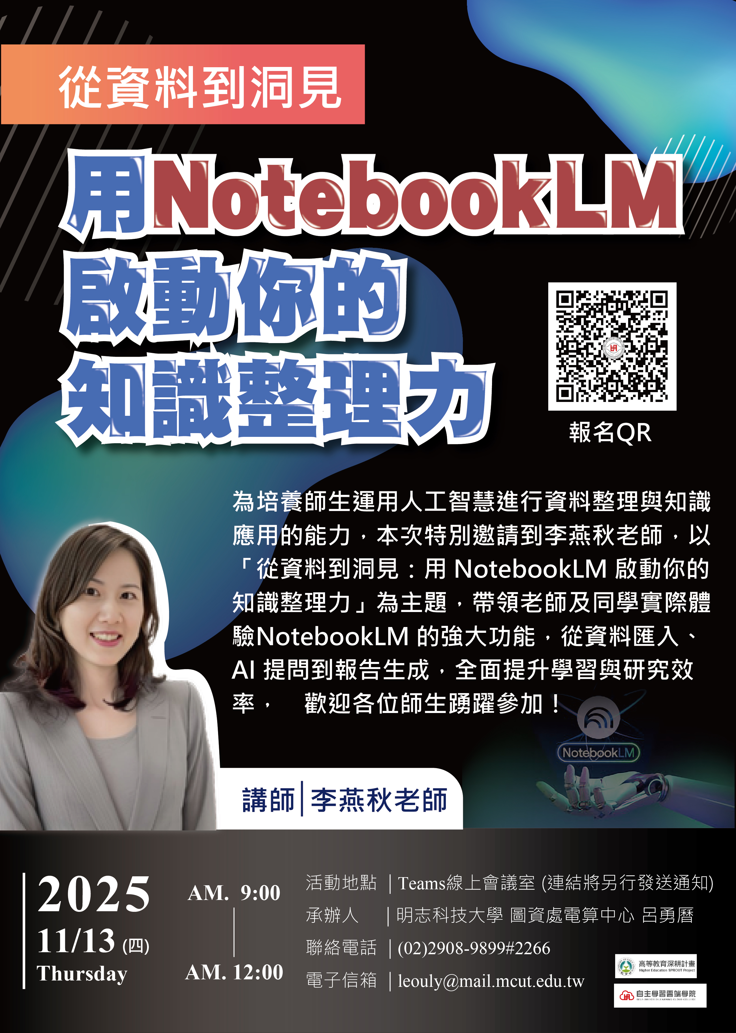 為回應人工智慧快速發展趨勢,並提升師生數位學習與資訊整合能力,明志科技大學電算中心於 114 年 11 月舉辦「NotebookLM 應用學習」線上講座,導入實務導向的 AI 工具教學,協助校內師生將大量資料轉化為可用資訊,進一步強化學習與教學效能。活動吸引眾多教職員與學生踴躍參與,展現校園對 AI 應用學習的高度關注。