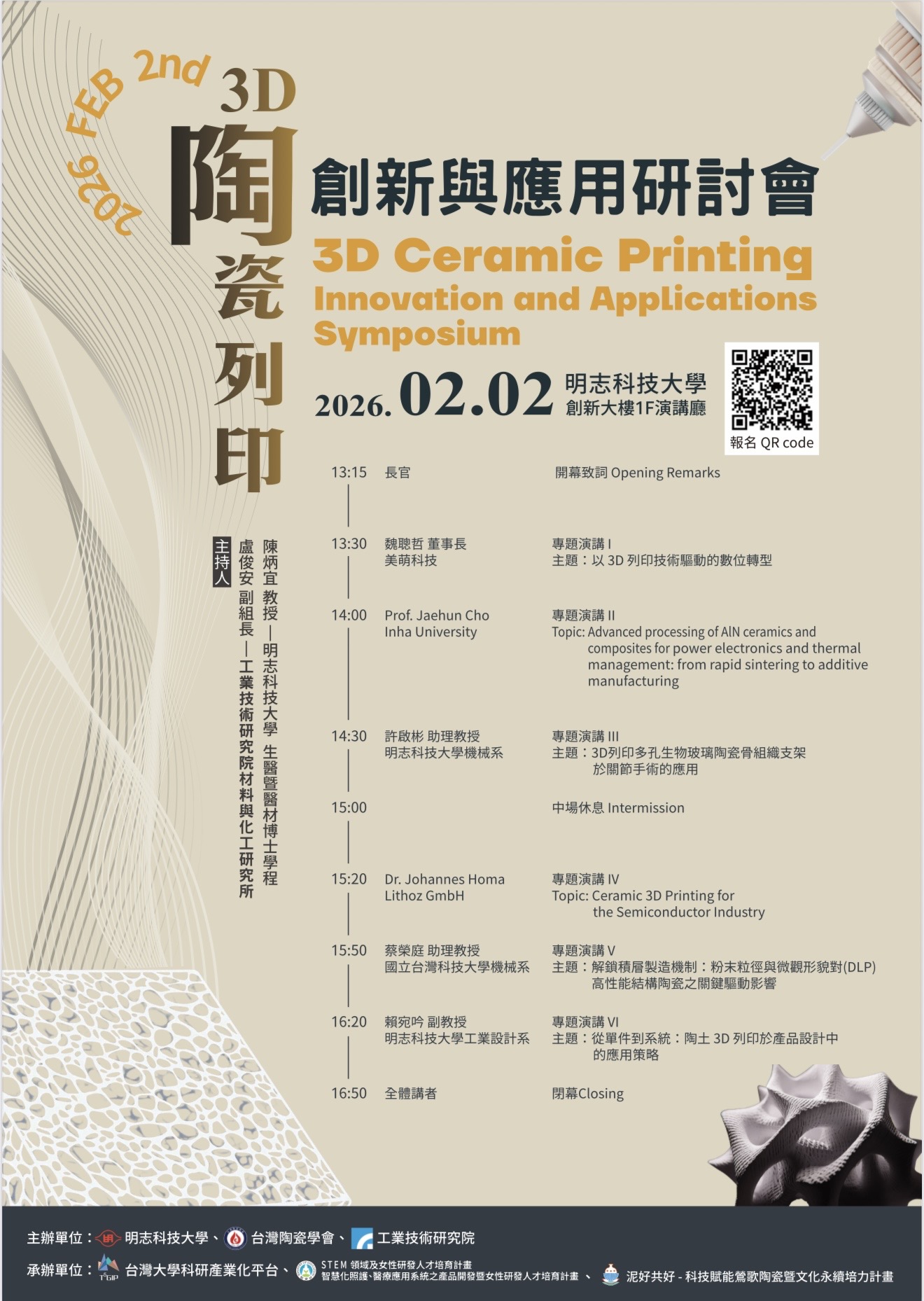 2026年2月2日,明志科技大學攜手台灣陶瓷學會及工業技術研究院,共同舉辦「3D陶瓷列印創新與應用研討會(3D Ceramic Printing Innovation and Applications Symposium)」,於校內順利舉行,吸引約150位來自產學研各界的專家學者與業界人士參與。此次研討會聚焦3D陶瓷列印於先進製程、半導體、電力電子、生醫及產品設計等領域之創新應用,提供跨領域交流平台,促進技術整合與產業鏈合作。