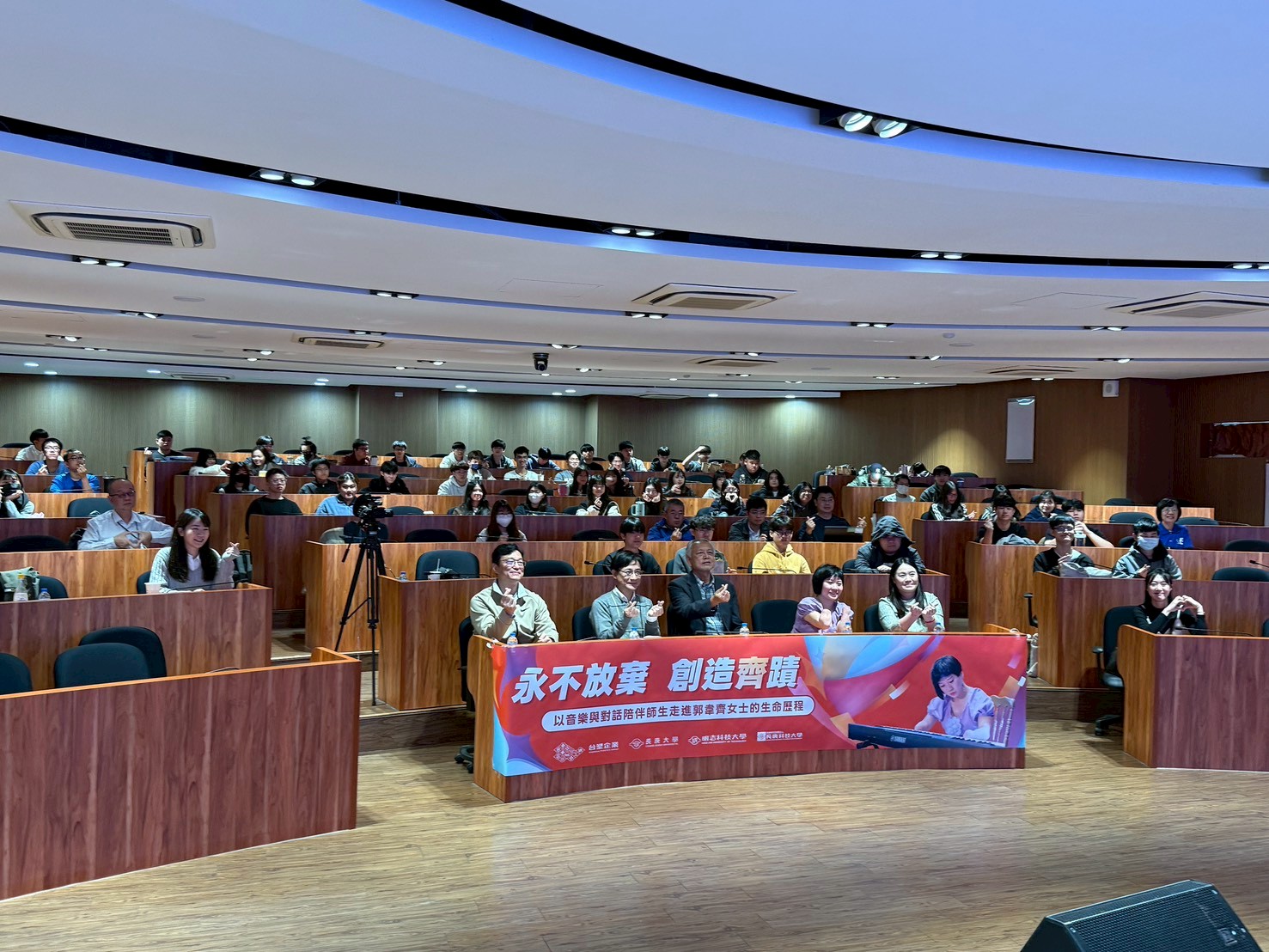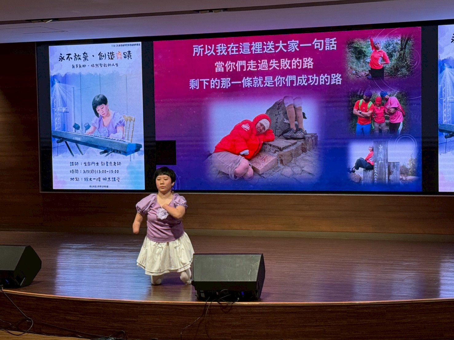 The speaker began by sharing her life experiences and engaging in meaningful dialogue with faculty and students. She invited the audience to reflect on what they might be able to do without the use of their hands and feet—a question that initially led many to feel that little could be done. She then invited participants on stage to experience writing with their wrists and playing the piano with their fists, allowing them to reflect on their thoughts and feelings. Ms. Kuo followed with a live demonstration of writing, piano playing, and dancing, which deeply moved the audience. During the reflection session, students shared that through firsthand experience, they came to realize that even without limbs, one can still face challenges with optimism, persist through difficulties, and bravely try new things to create one’s own path. The lecture concluded with a dance performance by Ms. Kuo, showing that with willingness and courage, seemingly impossible goals can be achieved, bringing the event to a heartfelt and uplifting close.