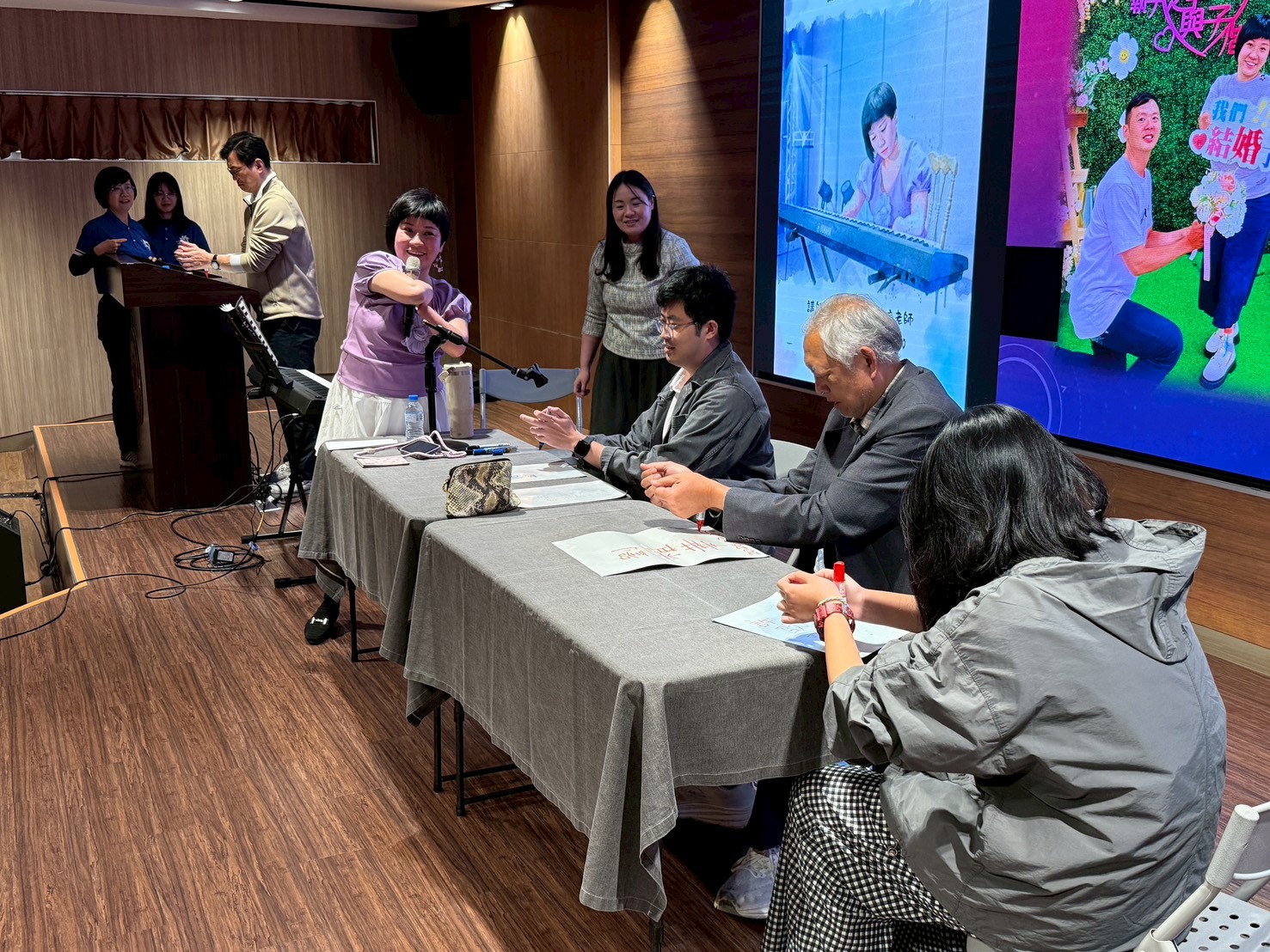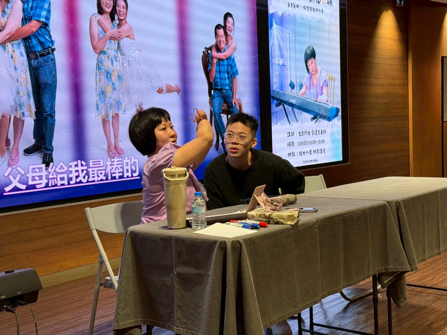 講師首先分享自己過去的經驗,並與現場的師長與學生進行深刻的對話,邀請大家思考當沒有雙手雙腳時,可以做些甚麼事情嗎?現場大家進入甚麼都不能做的想法中,此時,郭老師邀請師長和同學上台,體驗用手腕寫字、以拳頭彈奏鋼琴的感受及想法,隨後郭老師親身示範寫字、彈奏和舞蹈,震撼全場,活動後同學們分享感受,同學感性回饋,體驗後才驚覺,就算沒有手腳,只要保持著樂觀的心態去面對挫折,堅持下去、勇敢去嘗試,終能創造出屬於自己的一片天空。最後郭老師以舞蹈表演,讓大家看到只要妳願意嘗試,甚麼事情都能達成,講座在感動和愉悅的氣氛下畫下句點。